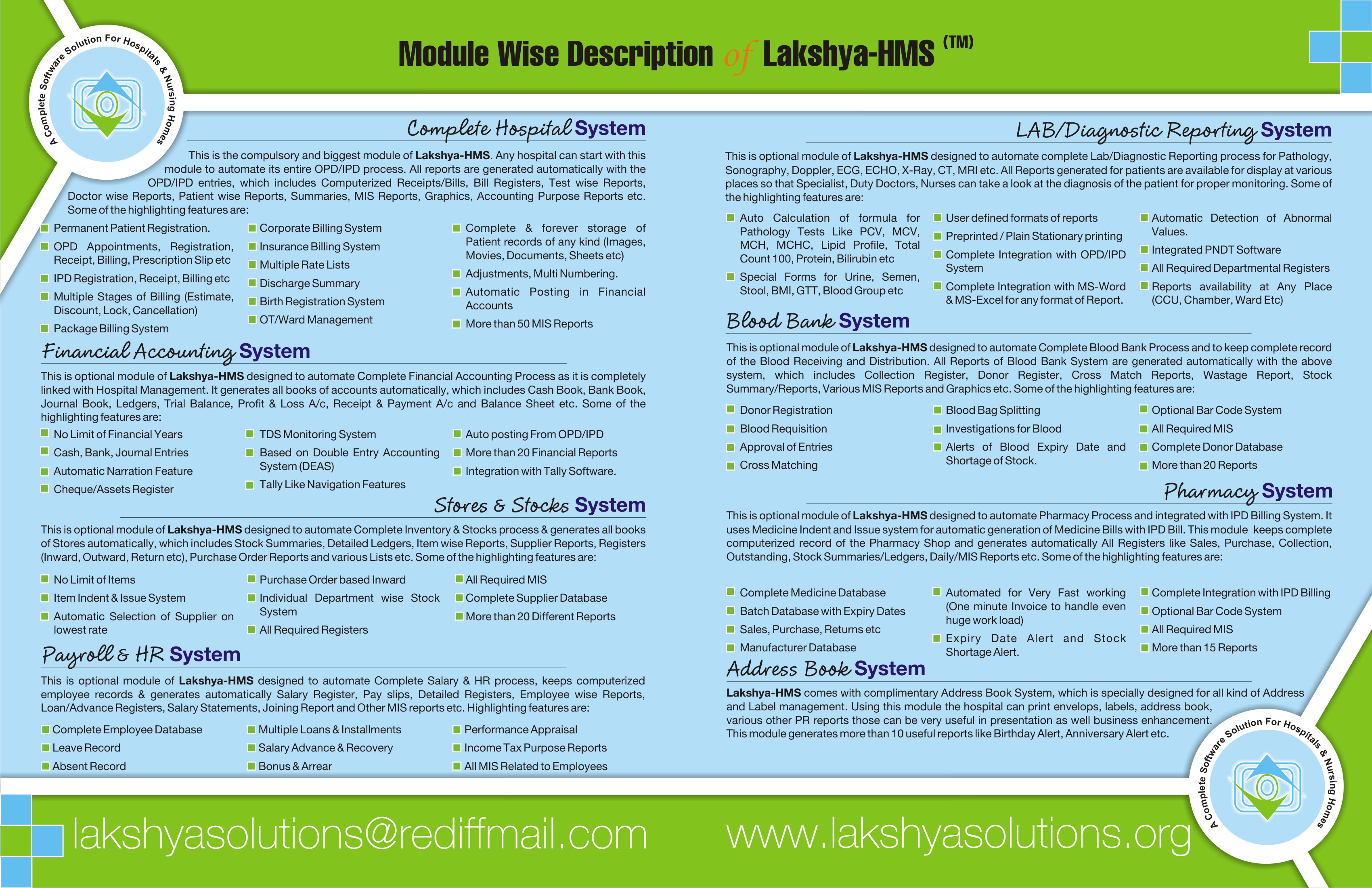 HMS This is the compulsory and biggest module of Lakshya-HMS. This module covers Complete UHID (PPIN)/OPD/IPD Registration, Billing, Receipts & reporting of the patients is provided along with Ward/Bed management and adjustment features. Any hospital can start with this module to automate its entire OPD/IPD process. From patient admission to discharge everything is covered in this module. Reports like Receipts/Bills, Bill Registers, Test wise reports, Doctor wise reports, Patient wise reports, Department wise reports, Summaries, MIS Reports, Graphics, Accounting purpose reports etc are generated from the software on a daily basis. More than 150 Reports and registers are designed to support all management level needs. Integration with Whatsapp and Email is a salient feature to improve communication and patient care. Basic NABH requirements have all been taken care in the software.